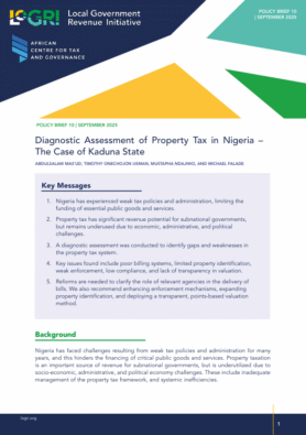 Nigeria has experienced weak tax policies and administration, limiting the funding of essential public goods and services. Property tax has significant revenue potential for subnational governments, but remains underused due to economic, administrative, and political challenges. To uncover these challenges, a diagnostic assessment was conducted to identify gaps and weaknesses in the property tax system in Kaduna State through surveys of stakeholders’ perspectives, including fiscal and tax authorities, land authorities, judiciary and legal professionals, financial services providers including tax practitioners, valuation and technology professionals, non-government actors and civil society organizations, as well as property taxpayers including property owners, developers, and property tenants. The findings from the surveys revealed key challenges relating to property tax administration in the state, including poor billing systems, limited property identification, weak enforcement, low compliance, and lack of transparency in valuation. Therefore, reforms are needed to clarify the role of relevant agencies in the delivery of bills. It is also recommended to enhance enforcement mechanisms, expand property identification, and deploy a transparent, points-based valuation method.