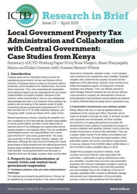Property taxes are an important revenue source for subnational governments. Across sub-Saharan Africa collection of property taxes is made up of several distinct processes, some situated at the national level, and some at the local level. Thus, inter-organisational cooperation and institution-based trust are essential for the successful implementation of property taxation. Because of the common centre-local tensions, there is now widespread acknowledgement that in sub-Saharan Africa property tax systems are not leading to the desired cycles of public investment and local government empowerment (R. W. Bahl and Bird 2013; R. W. Bahl, Martinez-Vazquez, and Youngman 2008; Cirolia and Mizes 2019; Collier 2016). Recent experiences in Kenya, including the adoption of a new constitution in 2010 that radically devolved responsibility to county governments, provides a novel opportunity to examine some of the challenges and opportunities facing property taxation in sub-Saharan Africa. The new constitution decentralised powers and responsibilities from central government to 47 new county governments. The study was conducted in three counties; Kiambu, Laikipia, and Machakos. Although the main source of funding for county governments is fiscal transfers from the national government, property taxes constitute the dominant revenue stream for most counties. County governments have the power to determine their own tax bases, property rates, and tax rates. This is a 2-page summary of Working Paper 95 by Rose Wanjiru, Anne Wanyagathi Maina & Eldah Onsomu with Graeme Stewart-Wilson