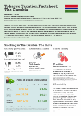 Tobacco use causes more than 8 million deaths globally each year, with more than 80% of the world’s smokers living in low- and middle-income countries. The cost of tobacco in West Africa, both in terms of the negative impact on public health and the economy, will continue to grow if governments do not take decisive action to limit its use. Increasing tobacco excise taxation is the most effective way to reduce tobacco consumption and improve health outcomes, while also raising government revenues. This factsheet examines the case for increasing tobacco taxation in The Gambia.